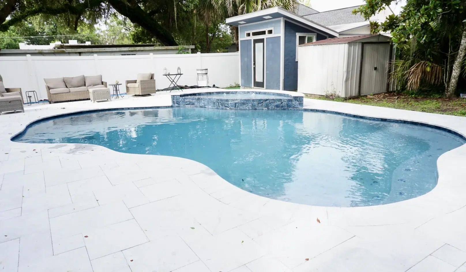 Today, the finished pool serves as a central feature of the Kissimmee backyard. The combination of the spillway fountain, mini pebble interior, and travertine deck creates a space that feels visually distinctive while remaining easy to use.